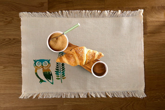 Handbedrucktes Baumwoll-Platzset mit liebevoll gestaltetem Eulenmotiv