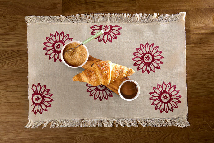 Handbedrucktes Baumwoll-Platzset mit liebevoll gestaltetem Blumenmotiv