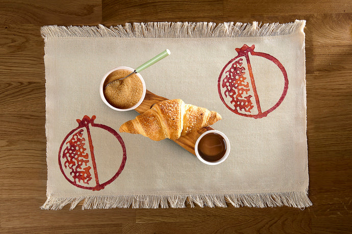 Handbedrucktes Baumwoll-Platzset mit liebevoll gestaltetem Granatapfelmotiv