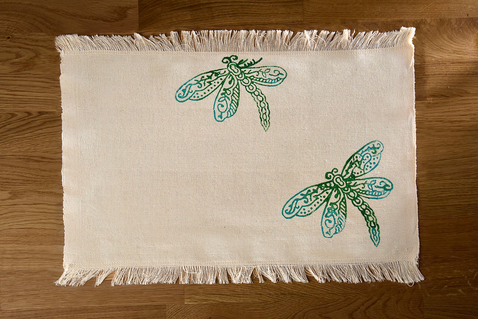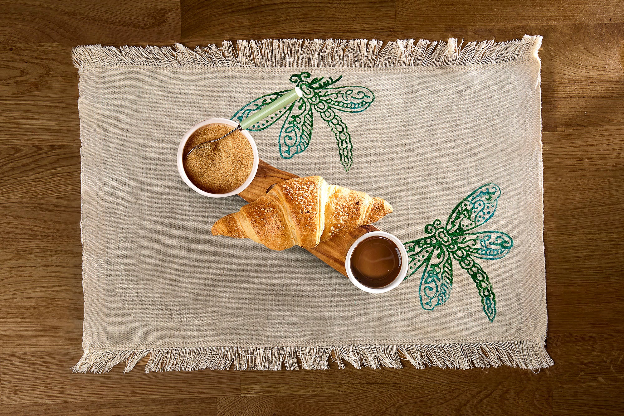 Handbedrucktes Baumwoll-Platzset mit liebevoll gestaltetem Libellenmotiv